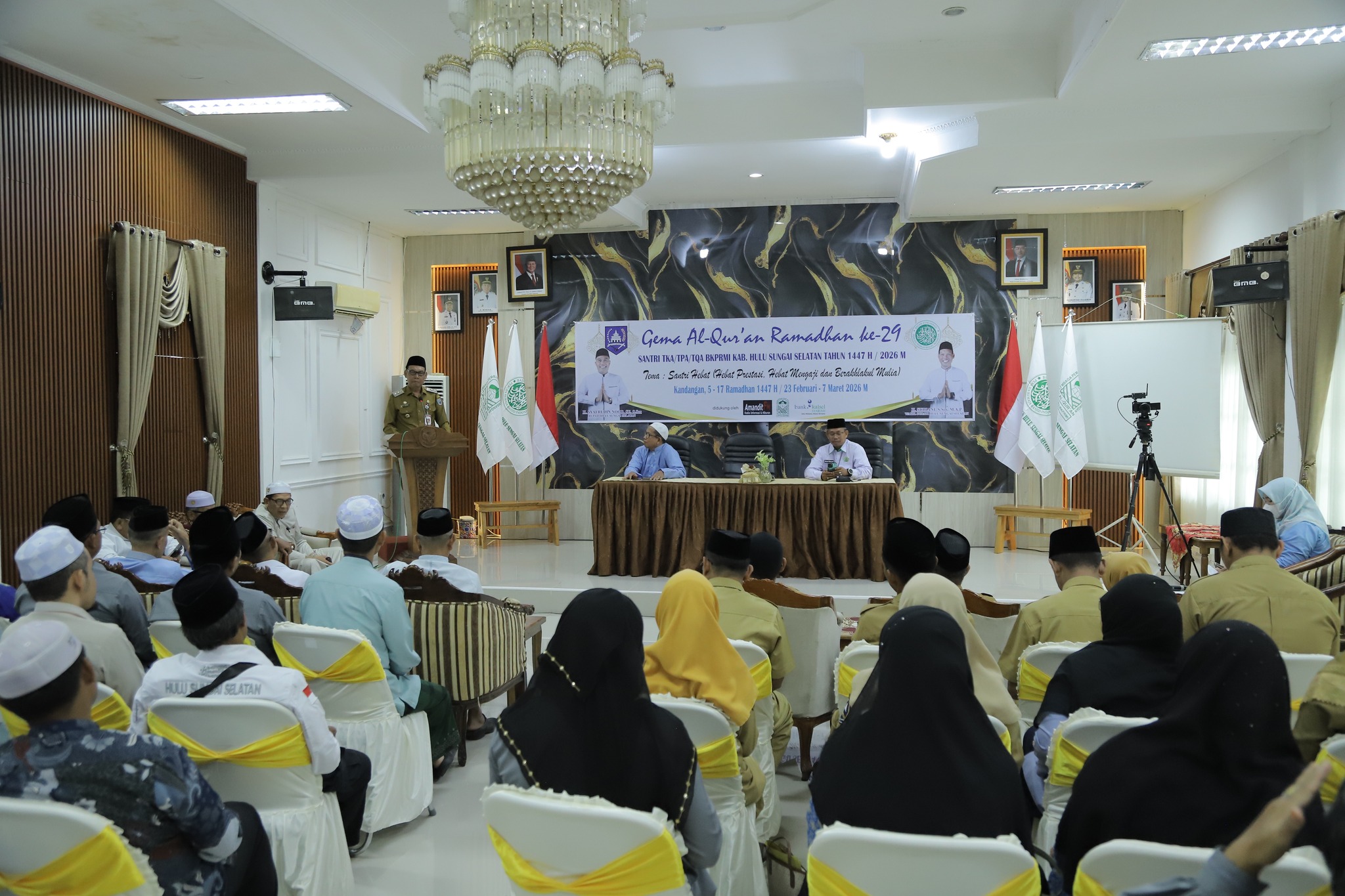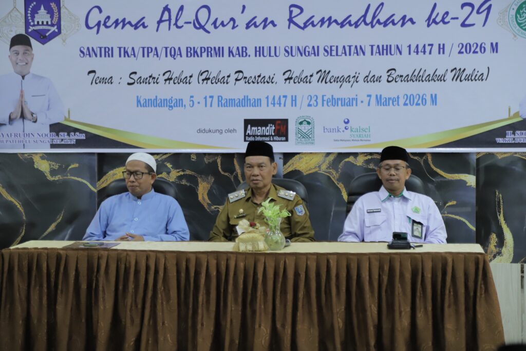 Wakil Bupati Hulu Sungai Selatan, H. Suriani, S.Sos., M.AP, secara resmi membuka kegiatan Gema Al-Qur’an Ramadan ke-29 Tahun 1447 H/2026 M, Senin(23/02/2026), bertempat di Pendopo Wakil Bupati. Kegiatan tahunan ini diselenggarakan oleh Radio Gema Amandit Kandangan bekerja sama dengan LPPTKA-BKPRMI Kabupaten Hulu Sungai Selatan, dengan mengusung tema “Santri Hebat (Hebat Prestasi, Hebat Mengaji dan Berakhlak Mulia)”.