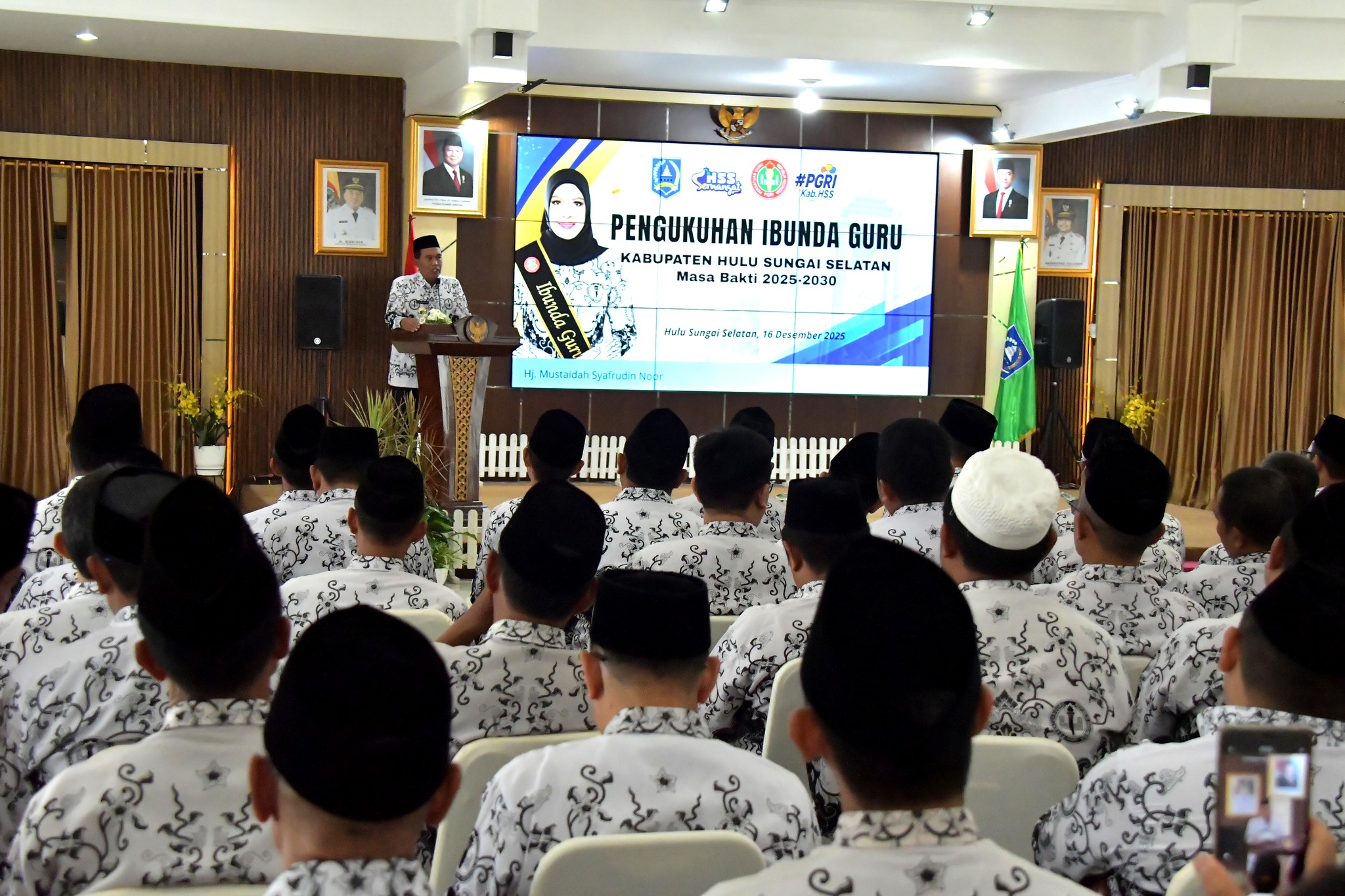 Kandangan – Bupati Hulu Sungai Selatan (HSS), H. Syafrudin Noor, SE., S.Sos., secara resmi mengukuhkan Hj. Mustaidah Syafrudin Noor sebagai Ibunda Guru Hulu Sungai Selatan. Pengukuhan tersebut dilaksanakan di Pendopo Bupati HSS, Selasa (16/12/2025).