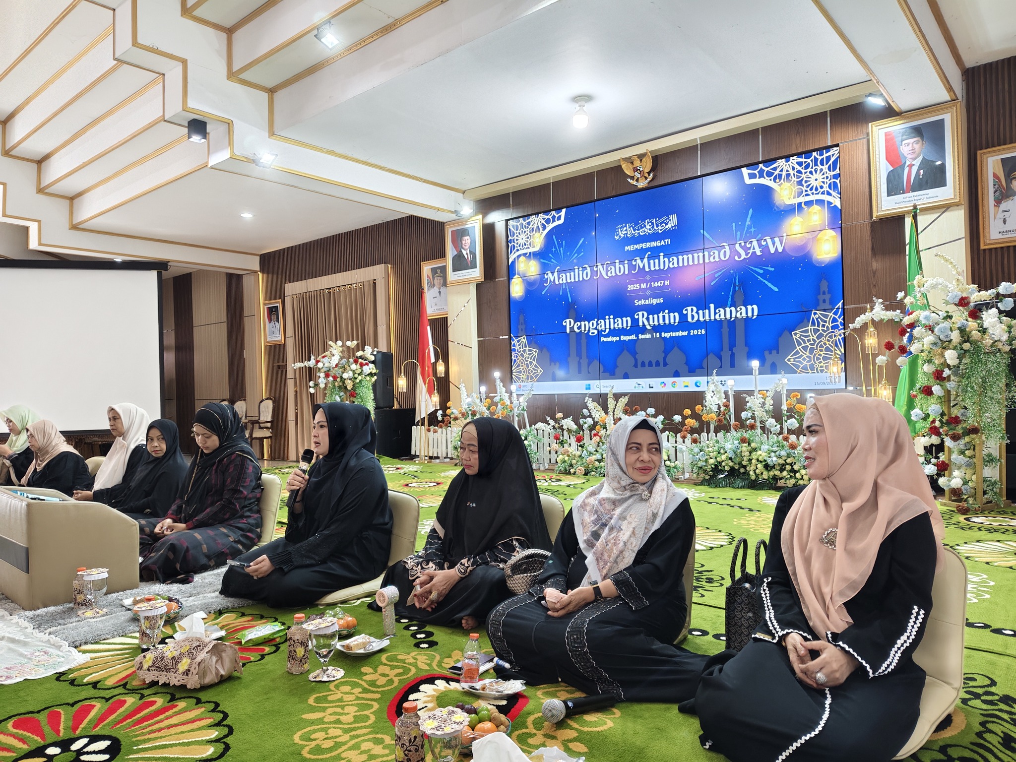 Kabupaten Hulu Sungai Selatan– Dalam rangka memperingati Maulid Nabi Muhammad SAW 1447H, isteri Bupati HSS Hj. Tata Syafrudin Noor yang juga menjabat sebagai Ketua TP-PKK Kabupaten Hulu Sungai Selatan (HSS), menggelar acara Peringatan Maulidurrasul yang dirangkaikan dengan Pengajian Bulanan, bertempat di Pendopo Bupati. Senin siang (15/09/2025).