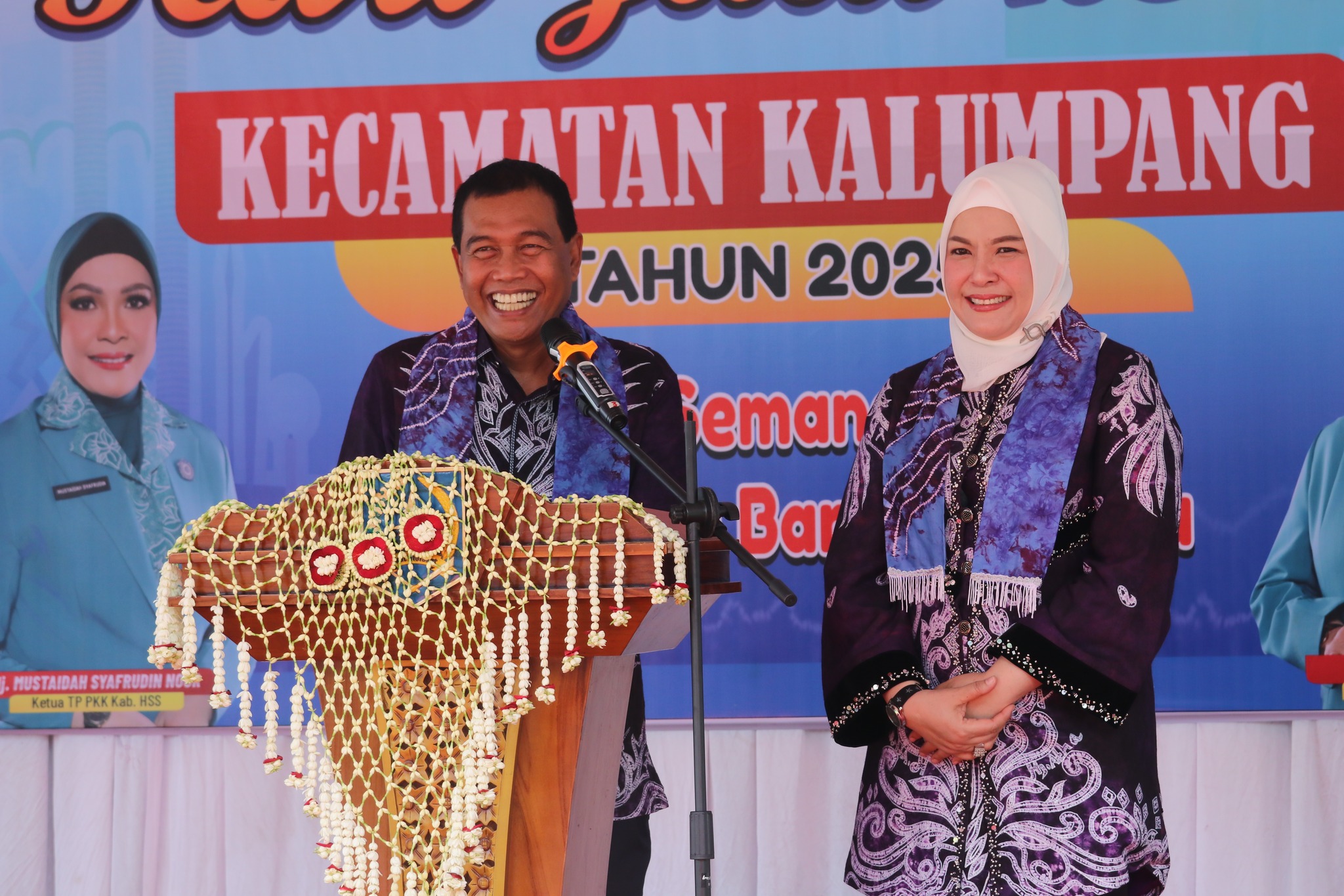 Bupati Hulu Sungai Selatan (HSS) H. Syafrudin Noor, S.E., S.Sos., bersama Ketua TP PKK Kabupaten HSS Hj. Mustaidah Syafrudin Noor menghadiri puncak peringatan Hari Jadi ke-45 Kecamatan Kalumpang, Kamis (26/11/2025).