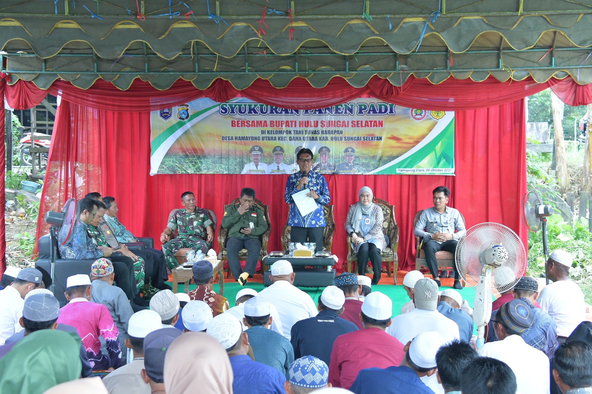 Sambutan Bupati HSS yang dibacakan oleh Wakil Bupati HSS, H. Suriani, menekankan bahwa panen raya ini bukan hanya sekadar hasil kerja keras petani, tetapi juga merupakan simbol kerja sama dan gotong royong yang dilandasi kesabaran. Pemerintah Kabupaten HSS, menyampaikan apresiasi yang setinggi-tingginya kepada KT. Tunas Harapan.
