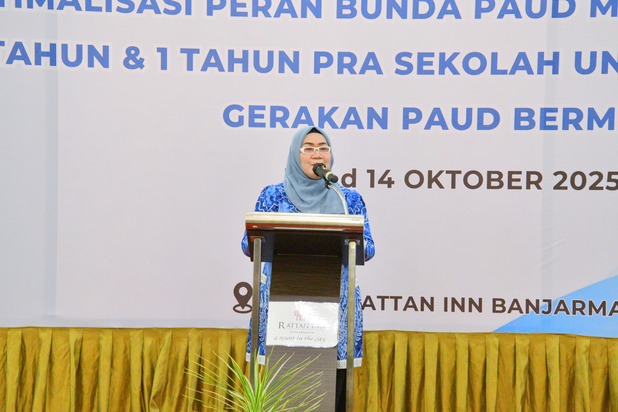 Ketua Kelompok Kerja (Pokja) Bunda PAUD Kabupaten Hulu Sungai Selatan (HSS) Hj. Misnawati Suriani menghadiri Pembukaan Bimbingan Teknis (Bimtek) Penguatan Kapasitas Pokja Bunda PAUD Kabupaten/Kota se-Kalimantan Selatan, yang digelar di Hotel Rattan Inn Banjarmasin, Minggu malam (12/10/2025).