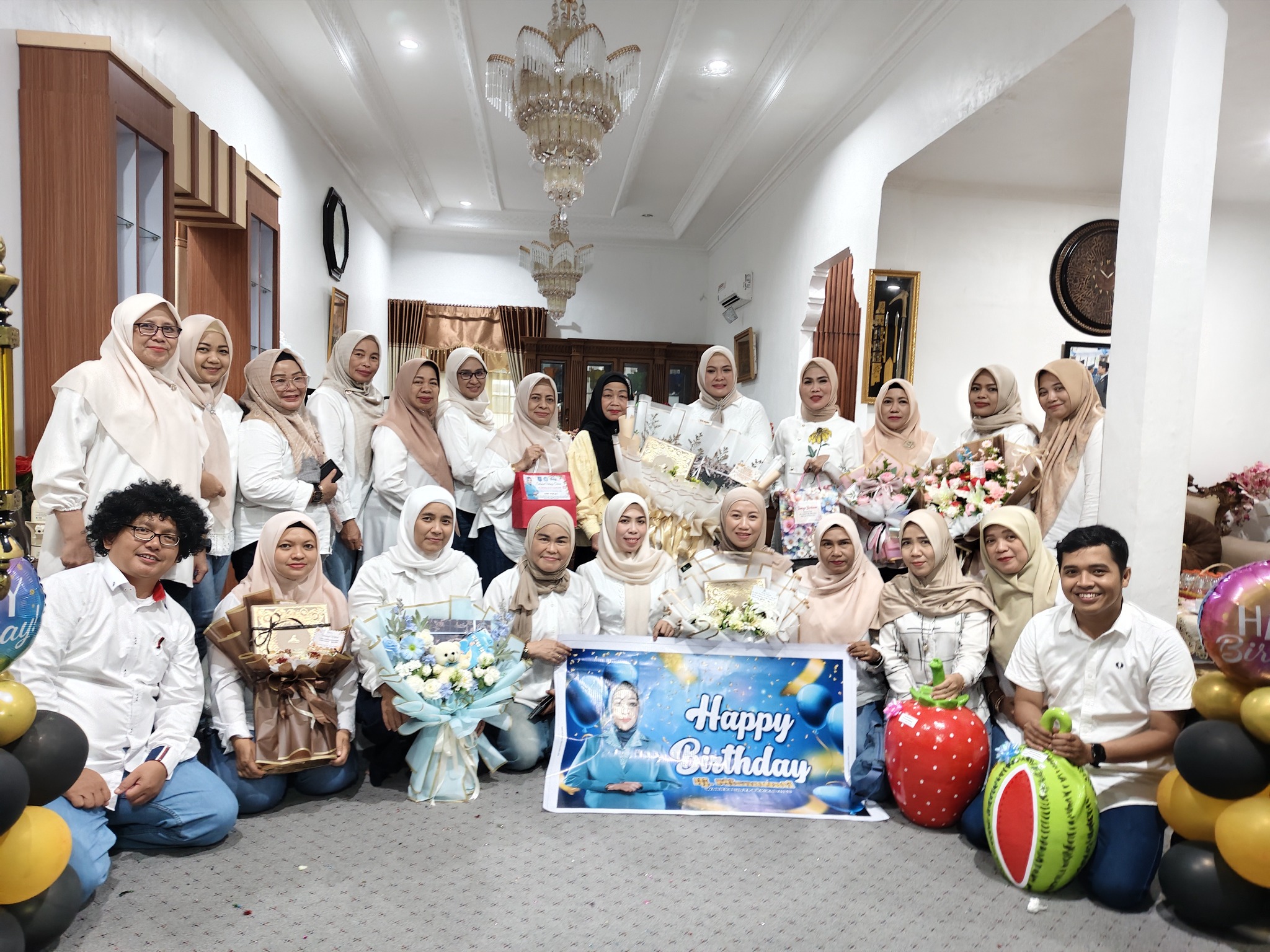 Ketua Tim Penggerak PKK Kabupaten Hulu Sungai Selatan (HSS), Hj. Mustaidah Syafrudin Noor, bersama jajaran pengurus TP PKK Kabupaten HSS memberikan kejutan milad kepada Wakil Ketua TP PKK Kabupaten HSS, Hj. Misnawati Suriani.