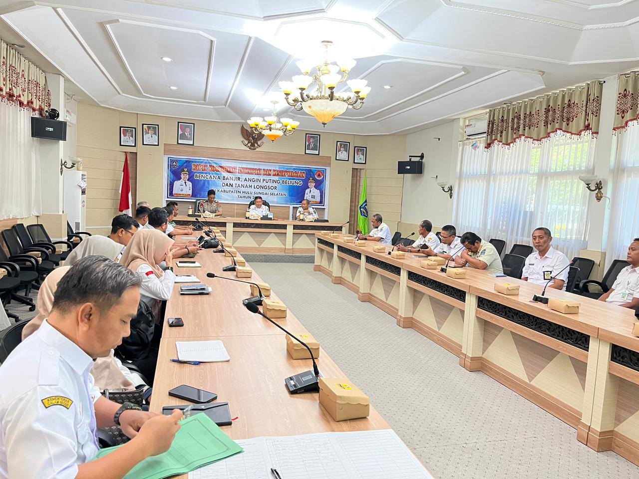 Pemerintah Kabupaten Hulu Sungai Selatan (Kab. HSS) menggelar Rapat Koordinasi Antisipasi dan Kesiapsiagaan Bencana Banjir, Angin Puting Beliung, dan Tanah Longsor Tahun 2025 sebagai langkah awal menghadapi musim hujan.