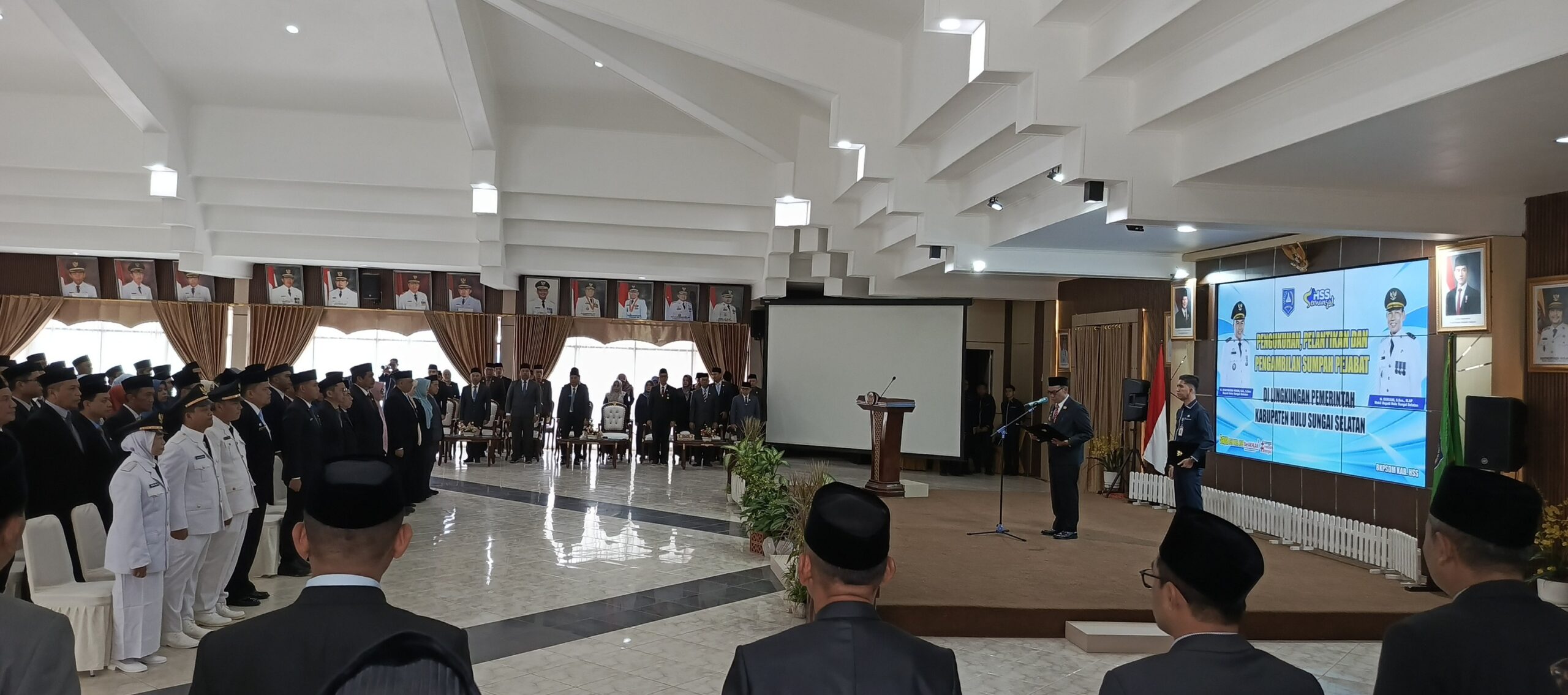 Suasana Pendopo Bupati Hulu Sungai Selatan (HSS) tampak khidmat saat Pemerintah Kabupaten HSS melaksanakan Pelantikan dan Pengambilan Sumpah Pejabat sebagai bagian dari upaya memperkuat pelayanan pemerintahan kepada masyarakat.