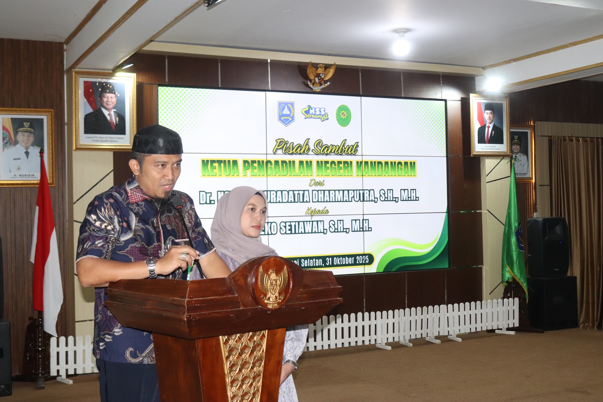 KANDANGAN – Lingkungan Pengadilan Negeri (PN) Kandangan menyelenggarakan acara pisah sambut Ketua PN yang lama, Dr. Ngurah Suradatta Dharmaputra, SH, MH, dengan pejabat yang baru, Eko Setiawan, SH, MH, pada Jumat malam (31/10/2025). Acara yang berlangsung khidmat dan penuh keakraban ini digelar di Pendopo Bupati Kandangan.