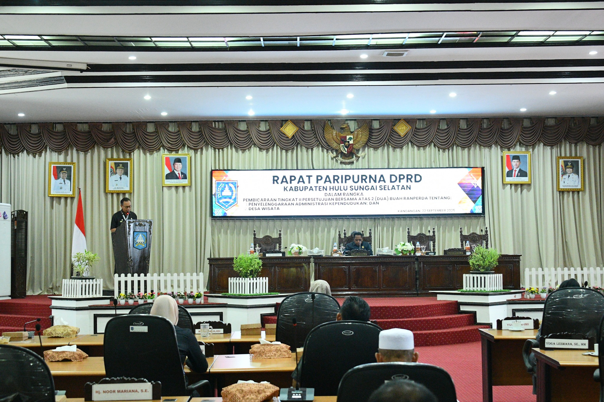 Jajaran Pemerintah Kabupaten Hulu Sungai Selatan (Pemkab HSS) menghadiri Rapat Paripurna Lanjutan Tingkat II DPRD HSS. Agenda rapat di ruang lantai 2 gedung dewan ini membahas dan mengesahkan dua rancangan peraturan daerah (ranperda) penting, masing-masing tentang Penyelenggaraan Administrasi Kependudukan dan Desa Wisata, Senin (22/9/2025).